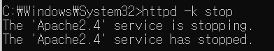 cmd에 httpd -k stop 서비스 종료 된 걸 확인 이 된다면