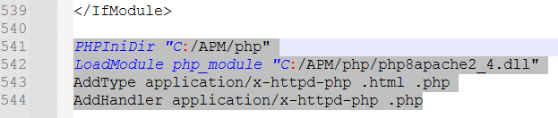 PHPIniDir "C:/APM/php" LoadModule php_module "C:/APM/php/php8apache2_4.dll" AddType application/x-httpd-php .html .php AddHandler application/x-httpd-php .php